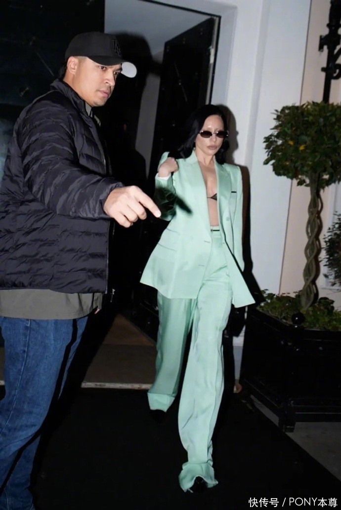 其二,短款西装版型,衣长恰好卡在腰线以上 2cm,与内搭的短款皮革文胸形成 “上短下长” 的搭配逻辑,再加上高腰西装裤的加持,轻松优化三七分身材比例,完全规避了小个子穿长款西装易显拖沓的问题。薄荷绿作为低饱和度的亮色,既比基础黑白色更具吸睛度,又不会像高饱和色彩那样挑肤色,衬得 Gaga 肤色愈发白皙透亮,为夜晚的巴黎街头增添了一抹清新又张扬的色彩。